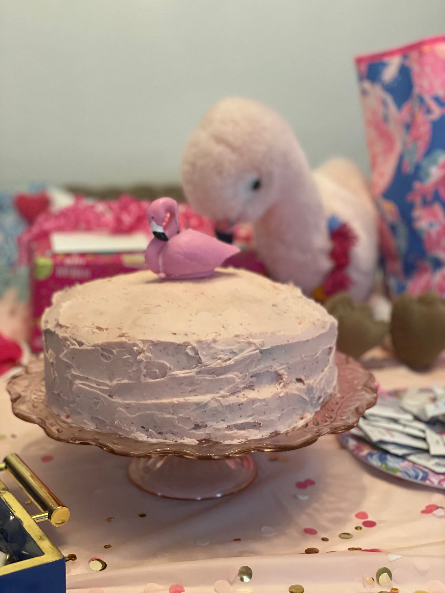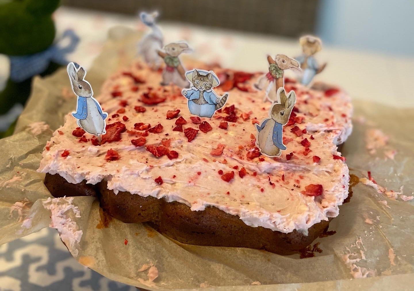 Cake Base: I start by getting two six inch pans and dividing a box of Simple Mills boxed cake mix. This will make a super cute two tiered cake. You may not realize this but if you have dark bakeware, you will need to turn your oven down by 25 degrees so it doesn’t overbake. I made this mistake on the Peter Rabbit cake. All different materials cook slightly differently.