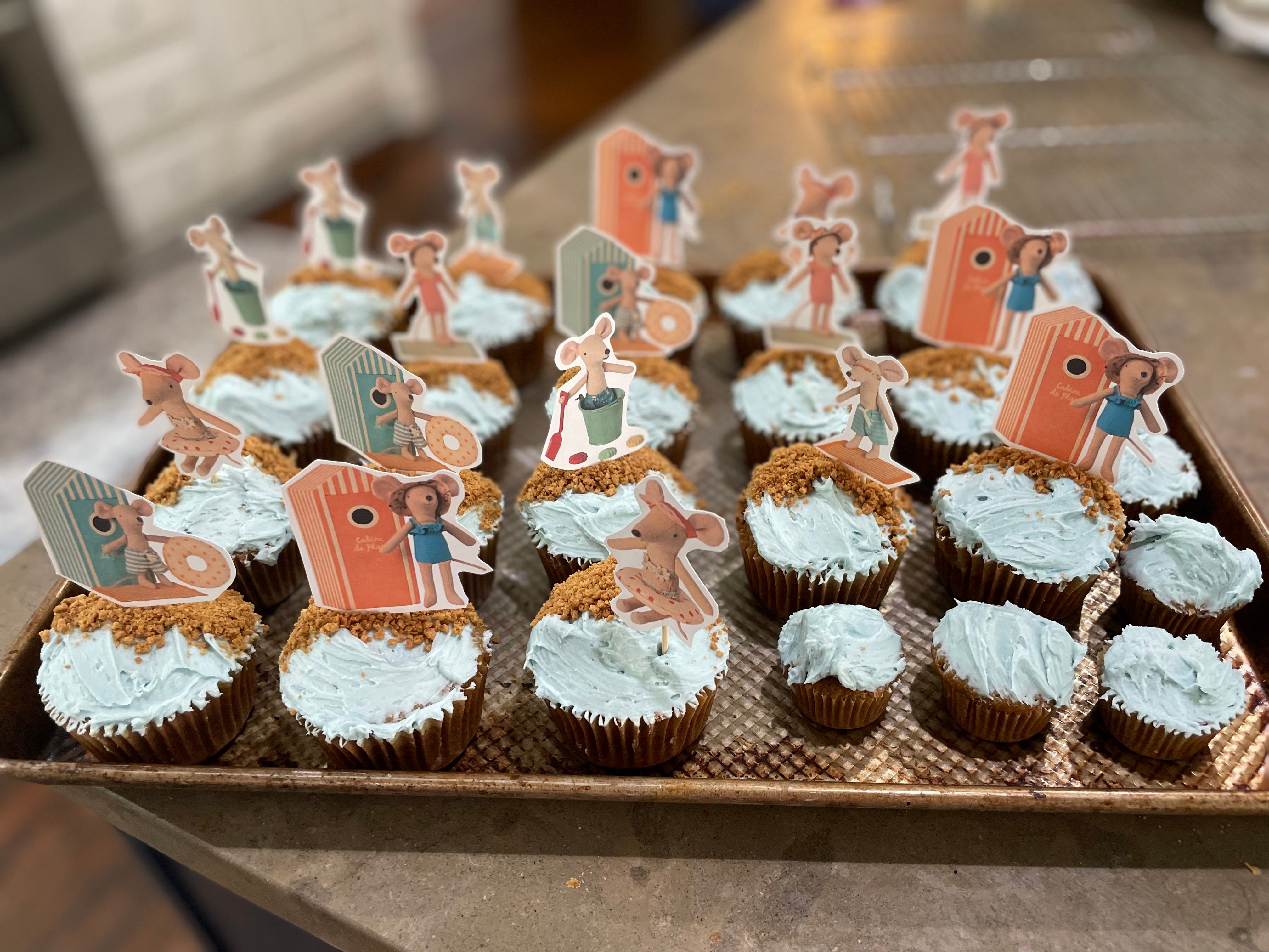 Toppers: I will find toppers on Amazon or make them myself! In the beach mouse cupcakes, I put all the images into Canva, printed onto card stock, cut them out, and attached them to toothpicks with Washi tape. I even reused some the next year on new toothpicks.