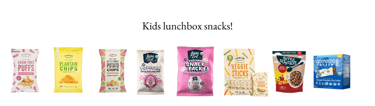 My kids favorite nut free snacks for school are GoMacro bars in any favor, Seven Sundays cereal (Maple is our favorite flavor), Lesser Evil popcorn, and Thrive Market grain free puffs, potato chips, veggie sticks, and plantain chips.