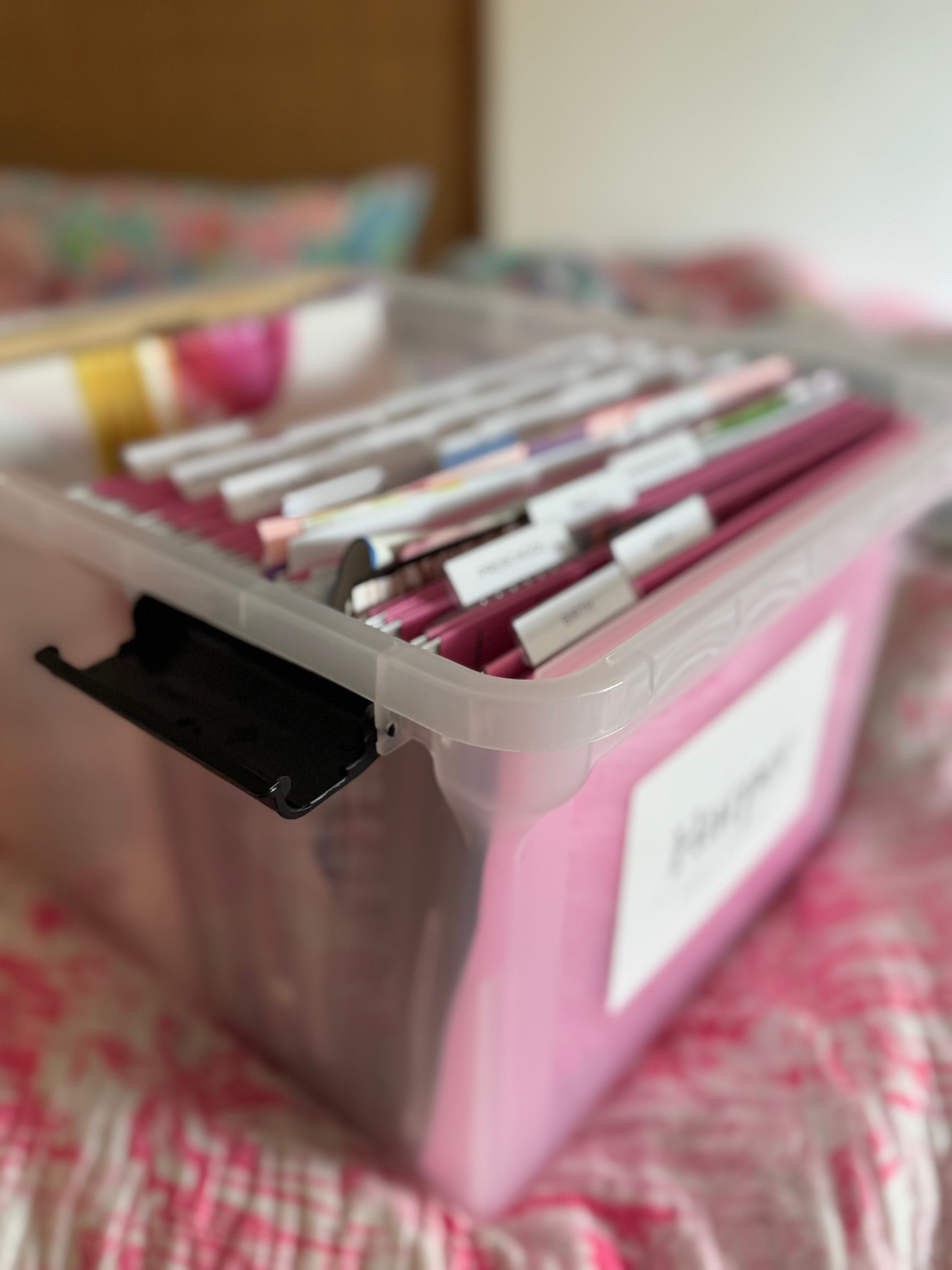 I finally started using this system and it really is working. I keep these boxes in an easy to reach place in their closets so I can pull them down and file items as we go. I know where everything is if I need to access it and it is SO much more manageable instead of having items in multiple boxes.
