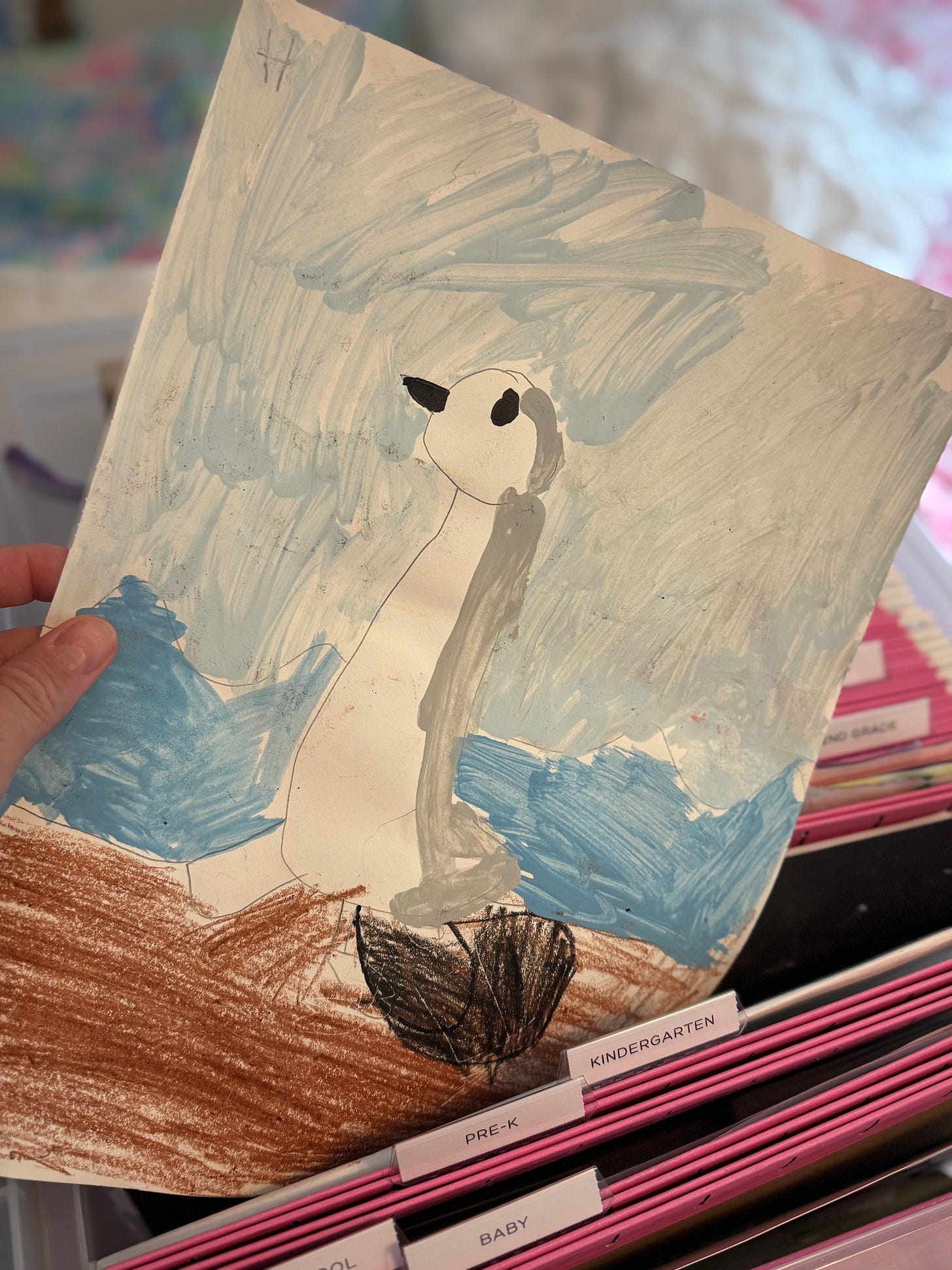 At the end of the school year, I get a portfolio of art from school. It’s generally the best 10 pieces. For now I’m saving them all but will probably pare them down in the future. For preschool art, anything with a handprint gets saved. With the kit that I bought, there is a school memory sheet so that I can interview each kid. My older child writes their own but I just interview the younger one starting in pre-k. I feel so much less overwhelmed with this system. It’s just one box for everything.