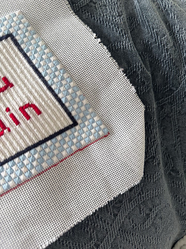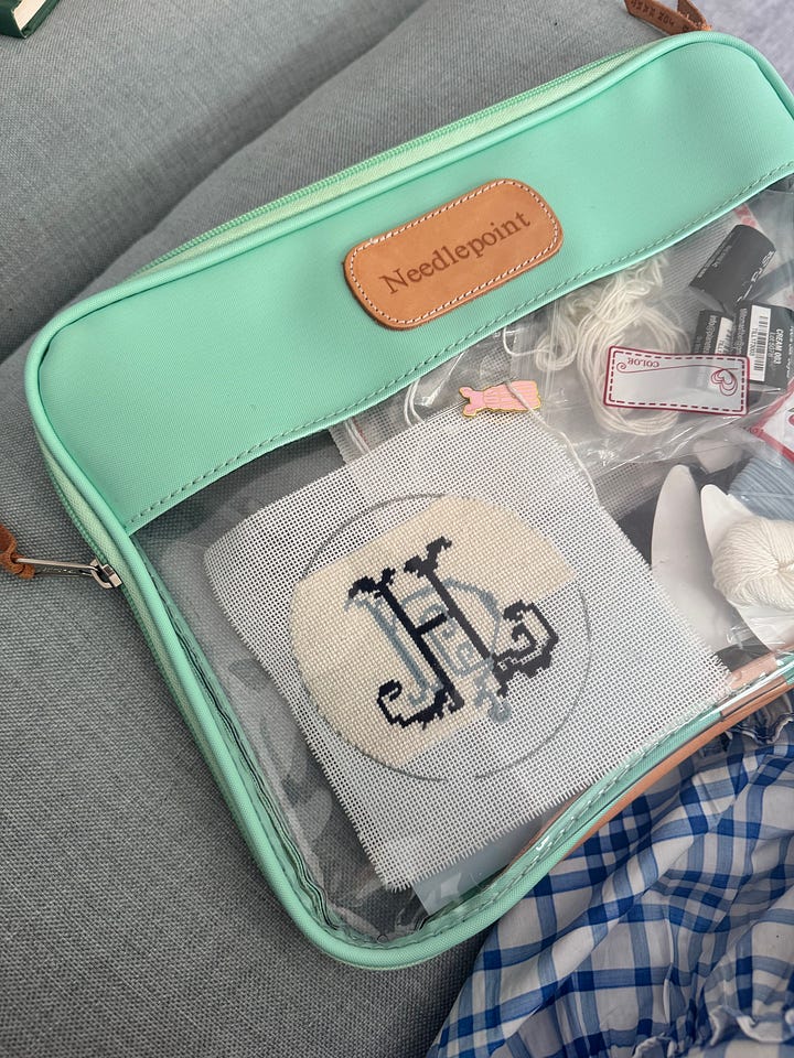 After my third was born, I’ve taken a bit of a break from needlepointing since my hands were constantly full. Lately we’ve found our rhythm with baby number three, and I have found pockets of time again to stitch! I truly enjoy this hobby and love it even more when I’m able to listen to a book or podcast while doing it. It feels like it completely resets my nervous system because you have to slow down so much to do it.